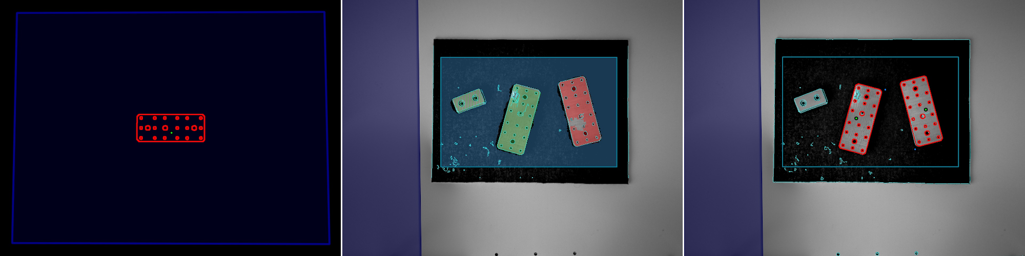 Abb. 24 „Template“, „Zwischenergebnis“ und „Ergebnis“ Bilder des SilhouetteMatch Moduls in der Web GUI für eine Detektion mit automatischer Objektebenenerkennung (object_plane_detection ist true)